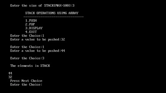 printf("\n\t 1.PUSH\n\t 2.POP\n\t 3.DISPLAY\n\t 4.EXIT");